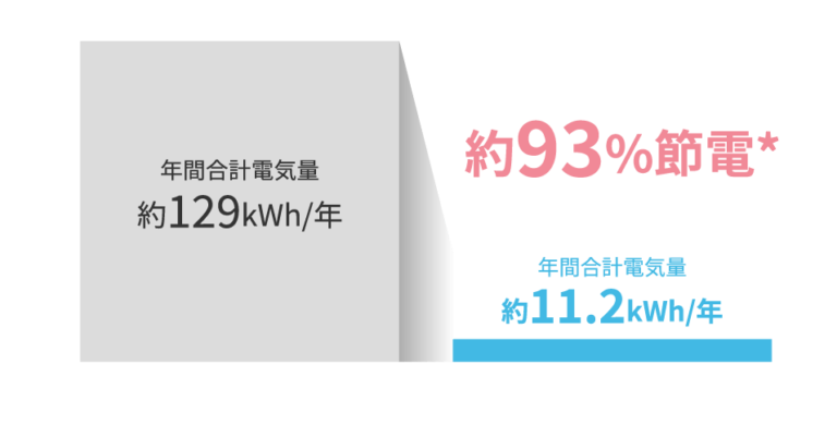 貯湯式の電気温水器は、タンクにお湯を貯めておいてずっとその中で温め続ける仕組みになっているため常に電気を使っています。翻って私たちインフィルの「エシカル水栓」は瞬間式の電気温水器のため、お湯を使うその時にしか電気を使わないという仕組みになっており、1年間に使用する電気量を比較すると、約93%*の節電が見込めます。