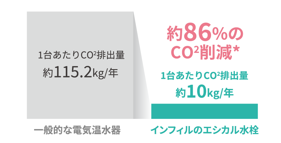 一般的な電気温水器から「エシカル水栓」に置き換えるだけで使用する電気の量がここまで下がるのですから、CO2排出量に置き換えることも可能で、そうすると一般的な電気温水器と比べ、1台あたり年間で約86%*のCO2排出量削減効果があります。