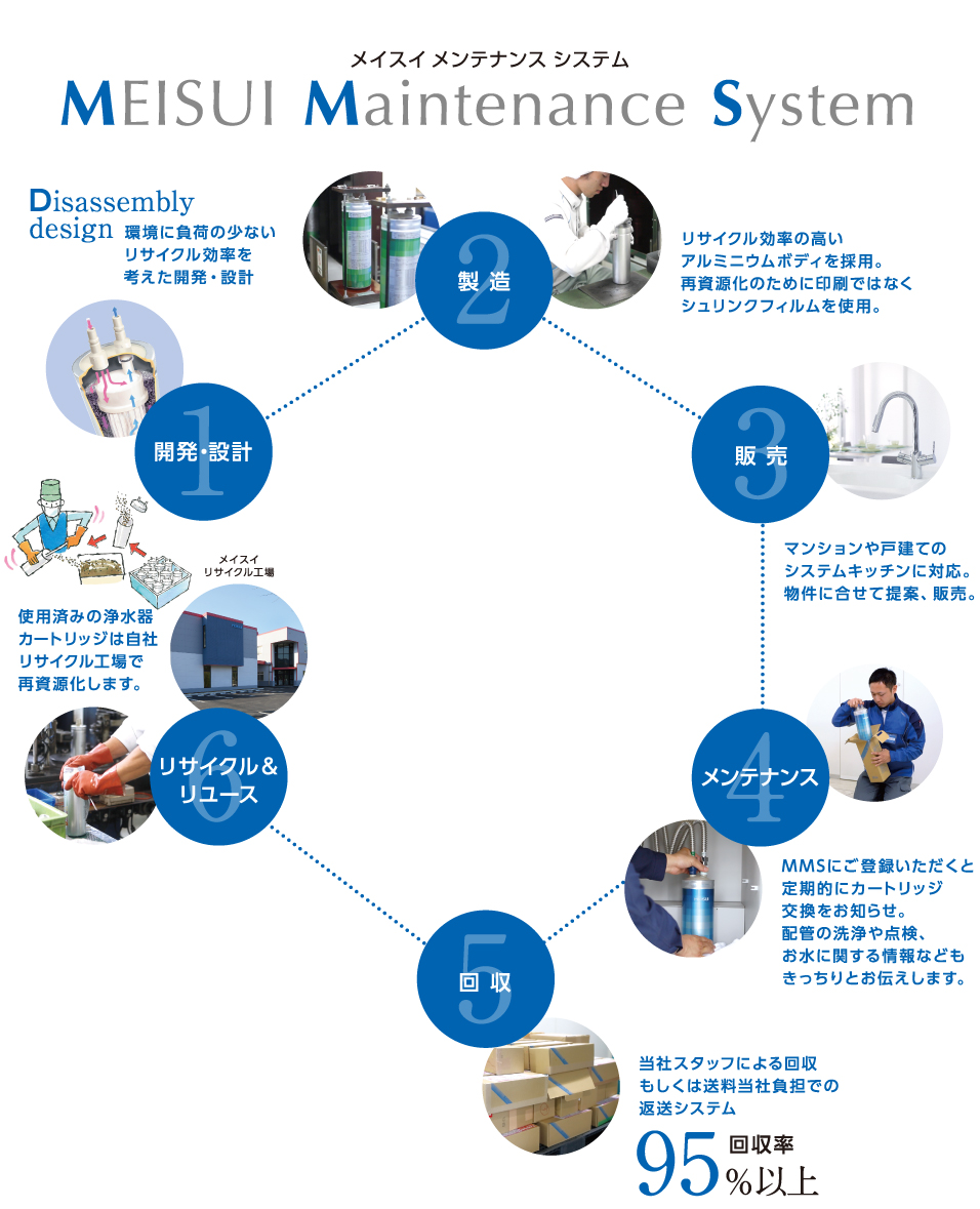 メイスイ様では「3R(Reuse・Reduce・Recycle)」の原則に基づき、浄水器の回収から再資源化まで一貫したシステムを構築しています(右図参照)。開発・設計段階から環境負荷が少なくリサイクル効率が考えられた製品に始まり、消耗品であるカートリッジ交換を回収する仕組み、そして使用済みカートリッジを工場で再資源化に至るまでを全て自社内で構築しているのです。それによりカートリッジの回収率は95%以上、回収された浄水器の再資源化率は100%との脅威的な達成率を実現。SMBC環境配慮融資において優良評価を獲得や、MMS(メイスイメンテナンスシステム)は「環境に負荷の少ないシステムを構築している」という点から、2016年度グッドデザイン賞を受賞するなど、様々なところでこうした持続可能な経営姿勢が社会的信頼性の向上に結びついているというわけです。