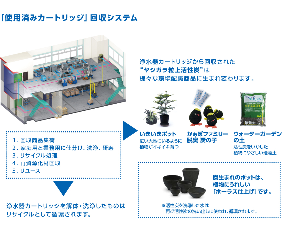 言葉にすると簡単そうにも見えますが、国内主要メーカーではそのほとんどが使用済みカートリッジの対応を「自治体区分に従って処分」としていたり、ヨーロッパやアジア地域では回収システムを構築している海外有名メーカーでも日本では回収システムが実現していなかったりしていることからも推し量れるように、こういった自社回収による再資源化を実現するシステムの構築は並大抵のことでは難しいのが実情です。以下の図のようにメイスイ様の使用済みカートリッジの回収システムを見てみるとその並々ならぬ企業努力の一端を感じ取ることができるのではないでしょうか?