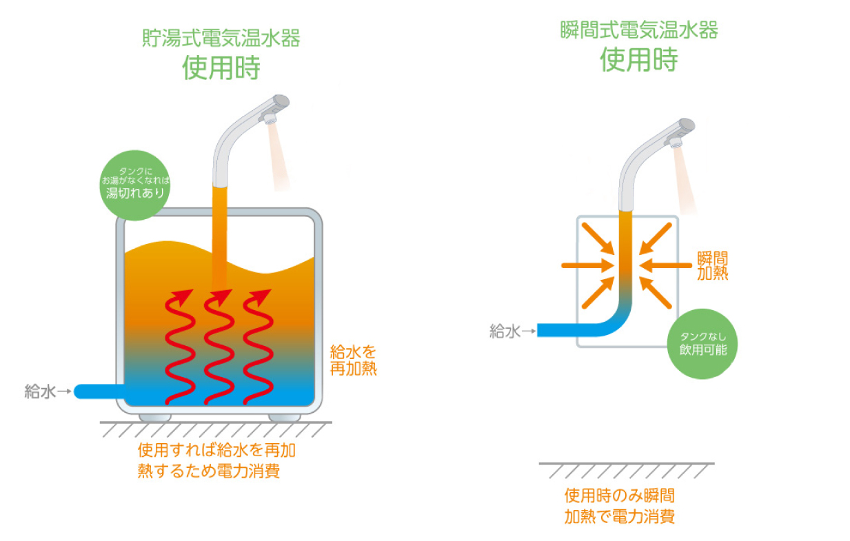 一方、飲用できる水栓は、エシカル水栓のような瞬間式の電気温水器を使っています。瞬間式がどのようにお湯を温めているのかというと、水道の蛇口を開いた瞬間に温水器内のヒーターに通電し、水を瞬時に温めてお湯にしています。つまり水道を使用する際に温水器を通った水だけを瞬間的に適温まで温めるという仕組みのため、いつでも飲むことのできる清潔な水が蛇口から出てきます。